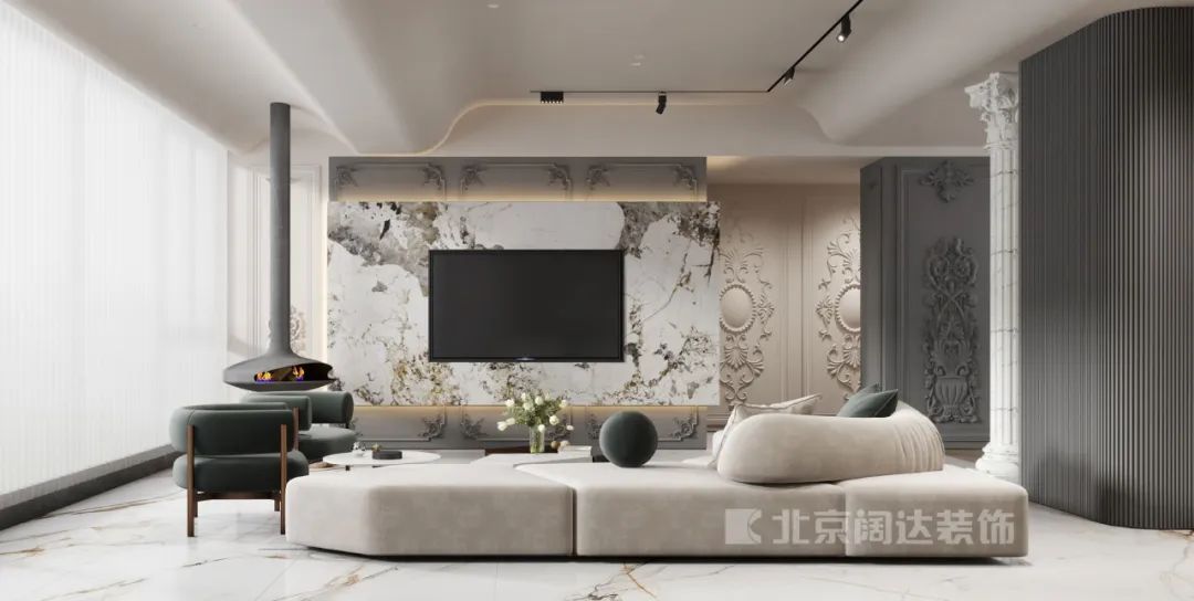 嵌入式設計的電視背景墻,結合巖板和法式線條護墻板,懸掛壁爐浪漫又不失質感,既保留了法式的柔和,也融入了現代的大氣。圓弧形的吊頂上,嵌入式無主燈散落在“星盤”里,給予生活最自然浪漫的光影支持。